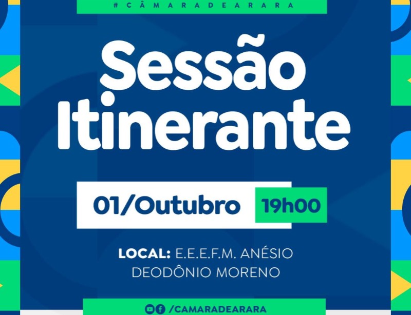 A câmara de Arara-PB realiza nesta quarta-feira, dia 1º de Outubro, uma sessão itinerante na escola Escola Estadual Anésio Deodônio Moreno, quando será realizada a instalação da placa em alusão aos 70 anos da instituição de ensino. A solenidade está marcada para ter início as 19h.