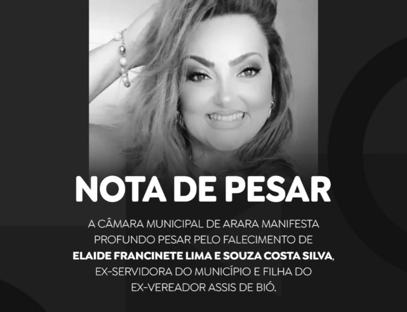 A Câmara de Arara manifesta profundo pesar pelo falecimento de Elaide Francinete Lima e Souza Costa Silva, ex-servidora do município e filha do ex-vereador Assis de Bió.